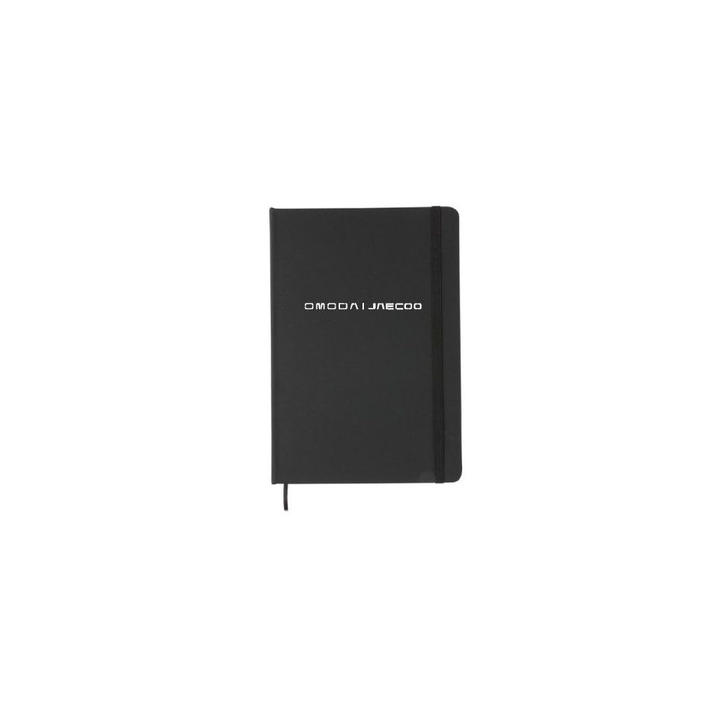 Zápisník v černé barvě s logem.